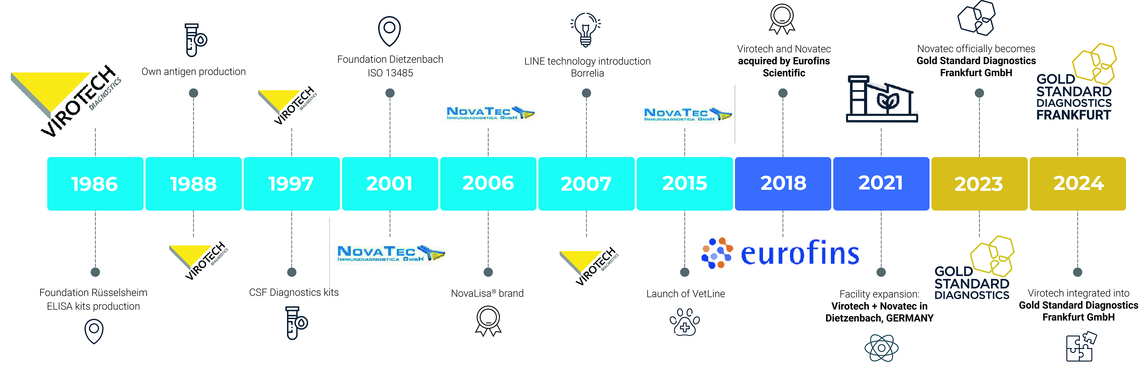 Gold Standard Diagnostics Frankfurt GmbH was established through the merger of two trusted names in diagnostic solutions: Virotech Diagnostics and Novatec Immundiagnostica. Both companies became part of the Gold Standard Diagnostics Group, combining their expertise to advance diagnostic excellence. Today, Gold Standard Diagnostics Frankfurt GmbH stands as a unified leader, committed to delivering reliable diagnostic tools to customers around the world.